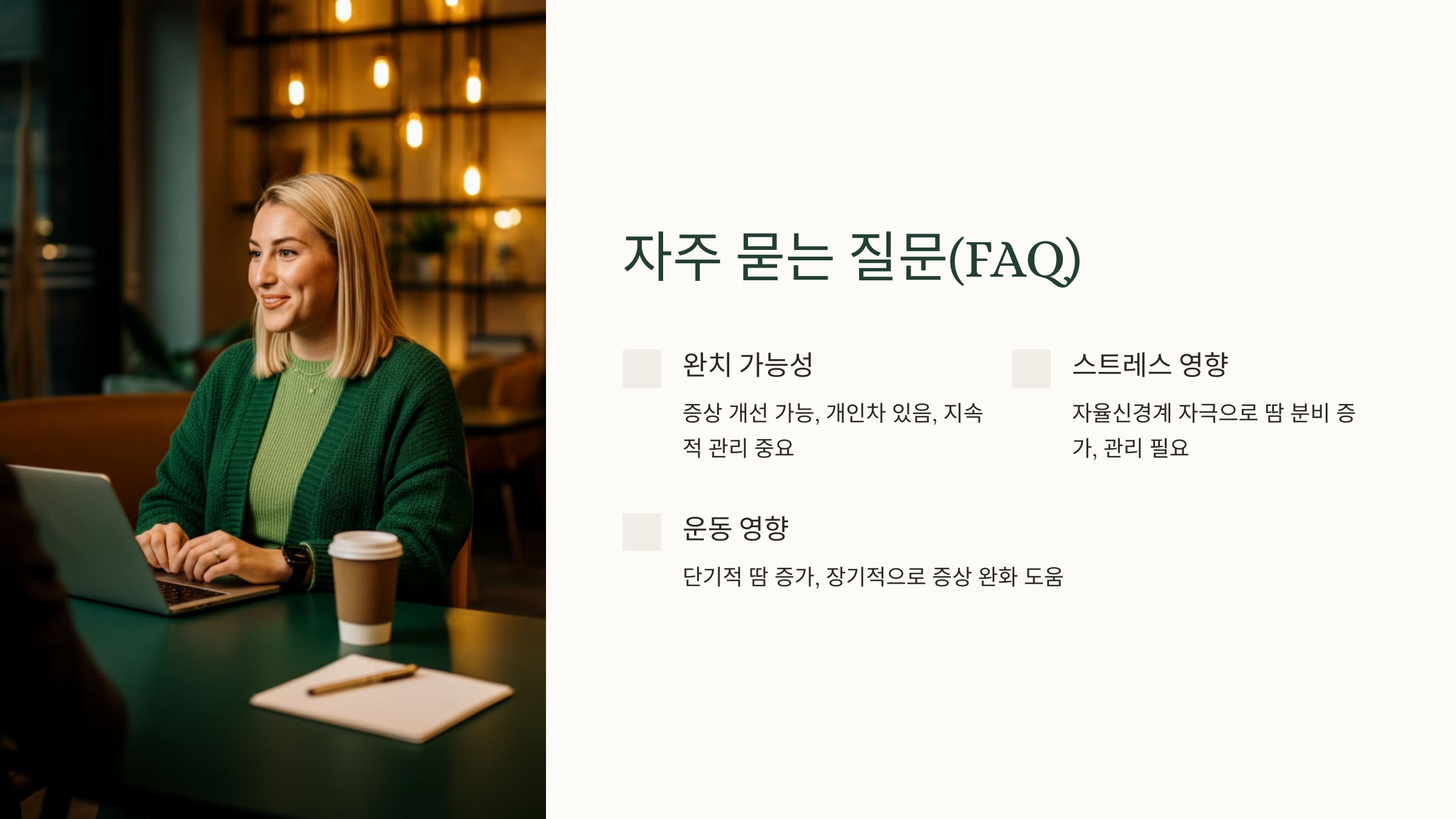 A. 운동 중에는 땀이 많이 나지만, 장기적으로는 자율신경계 조절에 도움이 돼 증상 완화에 좋을 수 있어요.