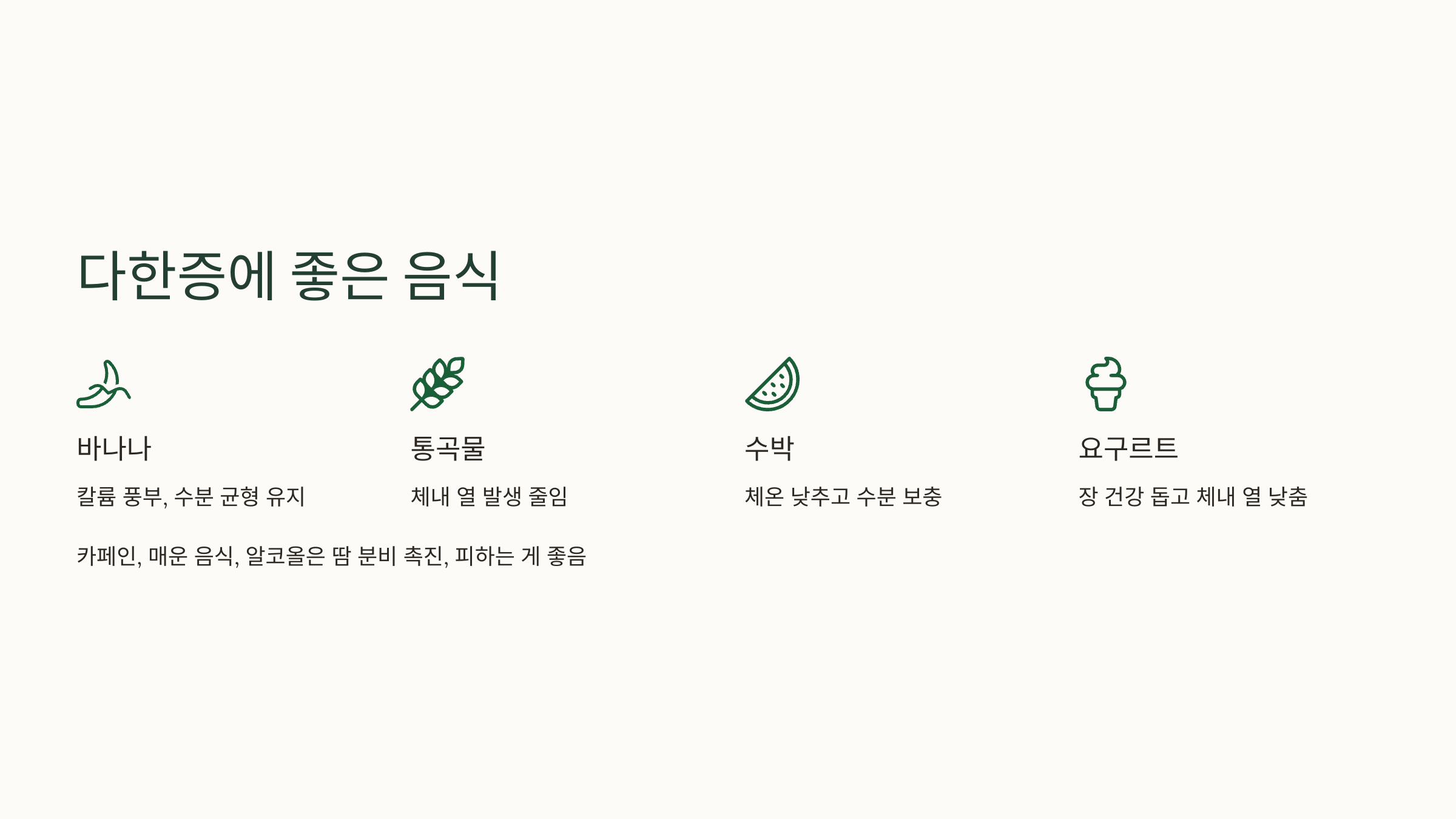 Tip! 반대로 카페인 음료, 매운 음식, 알코올은 땀 분비를 촉진할 수 있으니 피하는 게 좋아요.