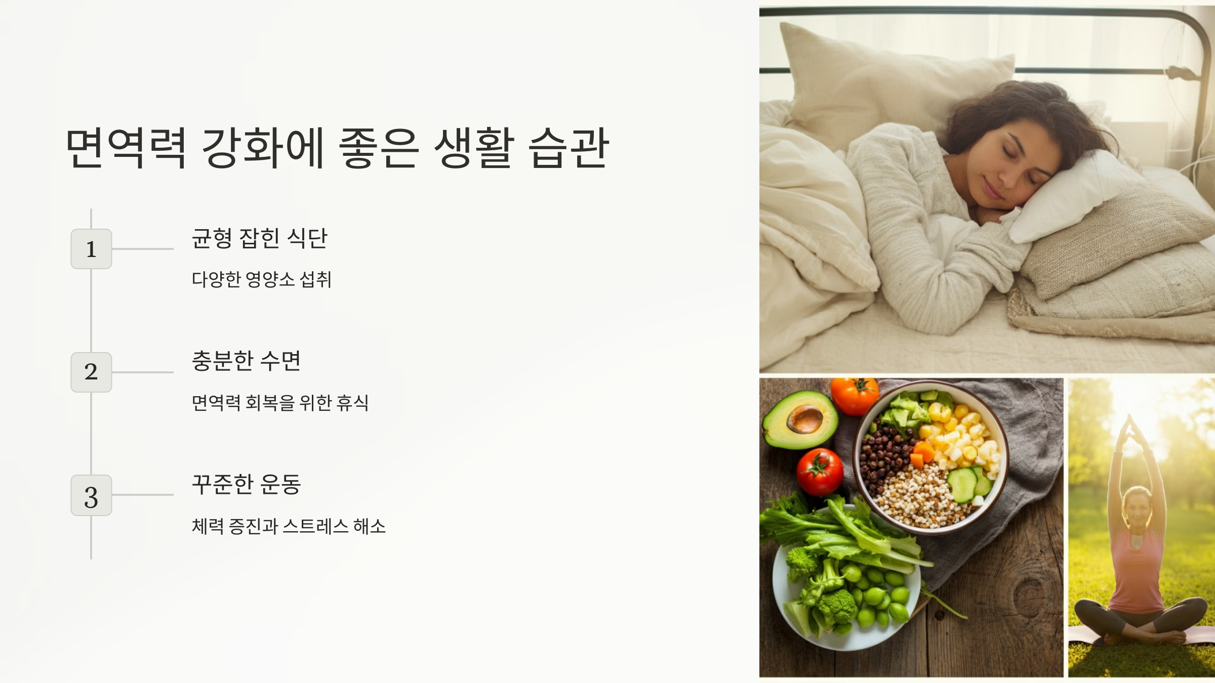 영양제 섭취뿐만 아니라 면역력을 높이려면 생활 습관도 중요해요.