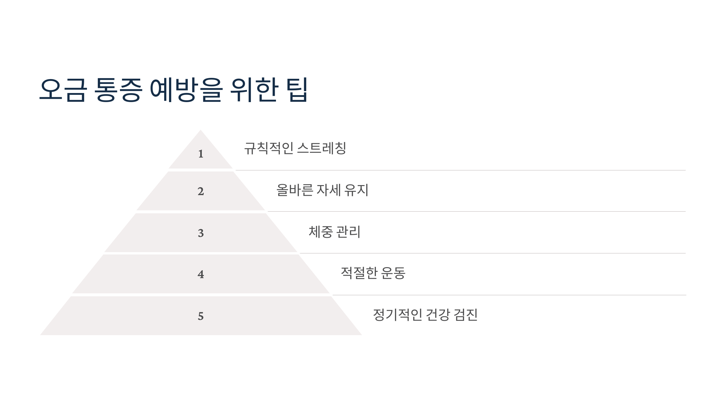 - 무리한 운동보다는 걷기, 수영, 요가처럼 관절에 부담을 덜 주는 운동을 추천합니다.