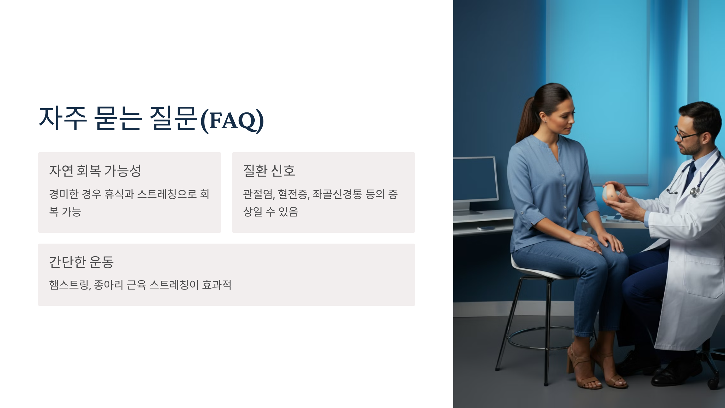 - 증상이 지속되거나 악화될 경우, 정형외과나 재활의학과에서 정확한 진단과 치료를 받는 것이 중요합니다.